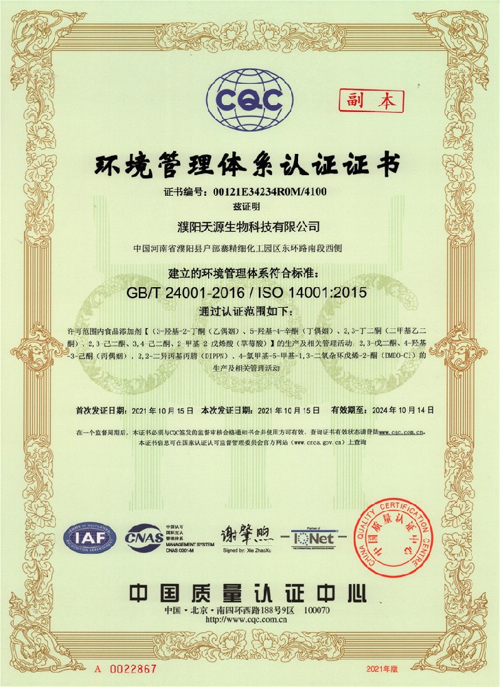 环境管理体系认证证书